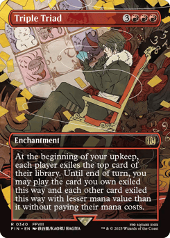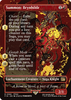 (As this Saga enters and after your draw step, add a lore counter. Sacrifice after III.) I — Chain — Exile the top card of your library. During any turn you put a lore counter on this Saga, you may play that card. II, III — Gestalt Mode — When you next cast a creature spell this turn, it gains haste until end of turn.