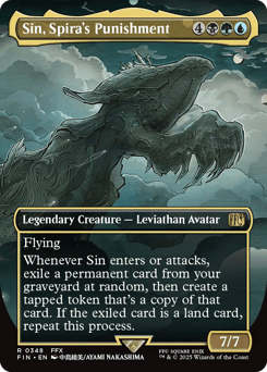Flying Whenever Sin enters or attacks, exile a permanent card from your graveyard at random, then create a tapped token that's a copy of that card. If the exiled card is a land card, repeat this process.