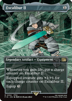 Whenever you gain life, put a charge counter on Excalibur II. Equipped creature gets +1/+1 for each charge counter on Excalibur II. Equip {3}