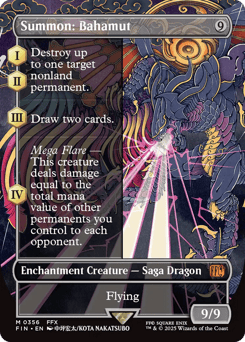(As this Saga enters and after your draw step, add a lore counter. Sacrifice after IV.) I, II — Destroy up to one target nonland permanent. III — Draw two cards. IV — Mega Flare — This creature deals damage equal to the total mana value of other permanents you control to each opponent. Flying
