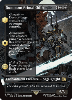 (As this Saga enters and after your draw step, add a lore counter. Sacrifice after III.) I — Gungnir — Destroy target creature an opponent controls. II — Zantetsuken — This creature gains "Whenever this creature deals combat damage to a player, that player loses the game." III — Hall of Sorrow — Draw two cards. Each player loses 2 life.