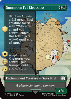 (As this Saga enters and after your draw step, add a lore counter. Sacrifice after IV.) I — Wark — Create a 2/2 green Bird creature token with "Whenever a land you control enters, this token gets +1/+0 until end of turn." II, III, IV — Kerplunk — Creatures you control gain trample until end of turn.