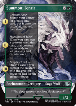 (As this Saga enters and after your draw step, add a lore counter. Sacrifice after III.) I — Crescent Fang — Search your library for a basic land card, put it onto the battlefield tapped, then shuffle. II — Heavenward Howl — When you next cast a creature spell this turn, that creature enters with an additional +1/+1 counter on it. III — Ecliptic Growl — Draw a card if you control the creature with the greatest power or tied for the greatest power.