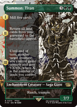 (As this Saga enters and after your draw step, add a lore counter. Sacrifice after III.) I — Mill five cards. II — Return all land cards from your graveyard to the battlefield tapped. III — Until end of turn, another target creature you control gains trample and gets +X/+X, where X is the number of lands you control. Reach, trample