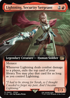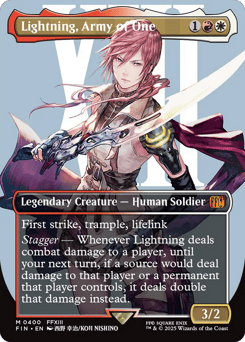 First strike, trample, lifelink Stagger — Whenever Lightning deals combat damage to a player, until your next turn, if a source would deal damage to that player or a permanent that player controls, it deals double that damage instead.
