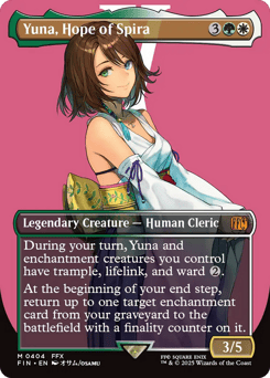 During your turn, Yuna and enchantment creatures you control have trample, lifelink, and ward {2}. At the beginning of your end step, return up to one target enchantment card from your graveyard to the battlefield with a finality counter on it. (If a permanent with a finality counter on it would be put into a graveyard from the battlefield, exile it instead.)