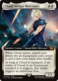 When Cloud enters, search your library for an Equipment card, reveal it, put it into your hand, then shuffle. As long as Cloud is equipped, if an ability of Cloud or an Equipment attached to it triggers, that ability triggers an additional time.