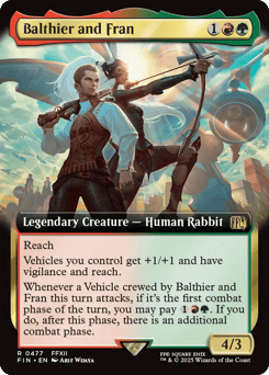 Reach Vehicles you control get +1/+1 and have vigilance and reach. Whenever a Vehicle crewed by Balthier and Fran this turn attacks, if it's the first combat phase of the turn, you may pay {1}{R}{G}. If you do, after this phase, there is an additional combat phase.