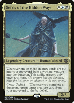 Whenever one or more creature cards are put into your graveyard from anywhere, venture into the dungeon. This ability triggers only once each turn. (To venture into the dungeon, enter the first room or advance to the next room.) Create Undead — Whenever you complete a dungeon, return target creature card from your graveyard to the battlefield.