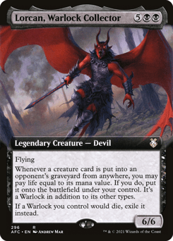 Flying Whenever a creature card is put into an opponent's graveyard from anywhere, you may pay life equal to its mana value. If you do, put it onto the battlefield under your control. It's a Warlock in addition to its other types. If a Warlock you control would die, exile it instead.