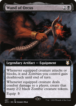 Whenever equipped creature attacks or blocks, it and Zombies you control gain deathtouch until end of turn. Whenever equipped creature deals combat damage to a player, create that many 2/2 black Zombie creature tokens. Equip {3}