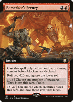 Cast this spell only before combat or during combat before blockers are declared. Roll two d20 and ignore the lower roll. 1—14 | Choose any number of creatures. They block this turn if able. 15—20 | You choose which creatures block this turn and how those creatures block.