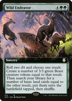 Roll two d4 and choose one result. Create a number of 3/3 green Beast creature tokens equal to that result. Then search your library for a number of basic land cards equal to the other result, put them onto the battlefield tapped, then shuffle.
