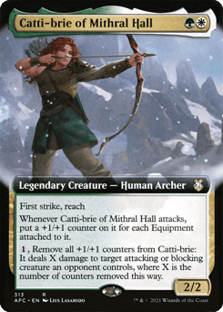 First strike, reach Whenever Catti-brie attacks, put a +1/+1 counter on it for each Equipment attached to it. {1}, Remove all +1/+1 counters from Catti-brie: It deals X damage to target attacking or blocking creature an opponent controls, where X is the number of counters removed this way.