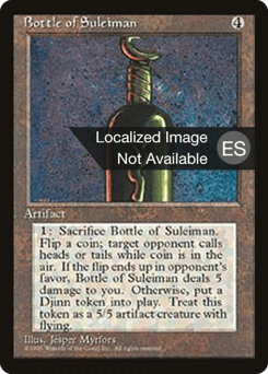 {1}, Sacrifice this artifact: Flip a coin. If you win the flip, create a 5/5 colorless Djinn artifact creature token with flying. If you lose the flip, this artifact deals 5 damage to you.