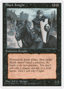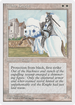 First strike (This creature deals combat damage before creatures without first strike.) Protection from black (This creature can't be blocked, targeted, dealt damage, or enchanted by anything black.)