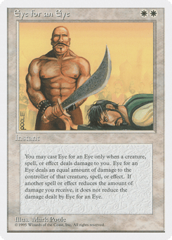 The next time a source of your choice would deal damage to you this turn, instead that source deals that much damage to you and Eye for an Eye deals that much damage to that source's controller.
