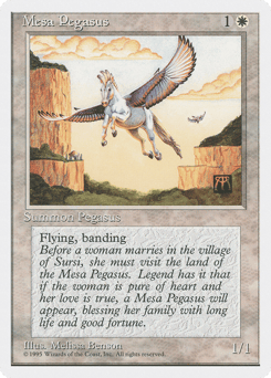 Flying; banding (Any creatures with banding, and up to one without, can attack in a band. Bands are blocked as a group. If any creatures with banding you control are blocking or being blocked by a creature, you divide that creature's combat damage, not its controller, among any of the creatures it's being blocked by or is blocking.)