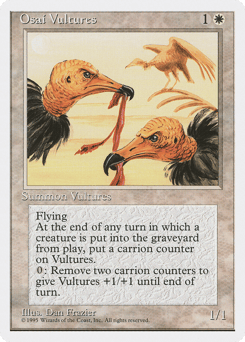 Flying At the beginning of each end step, if a creature died this turn, put a carrion counter on this creature. Remove two carrion counters from this creature: This creature gets +1/+1 until end of turn.