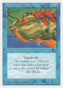 Trample This creature enters tapped and doesn't untap during your untap step. At the beginning of your upkeep, you may sacrifice two Islands. If you do, untap this creature. This creature can't attack unless you sacrifice two Islands. (This cost is paid as attackers are declared.)