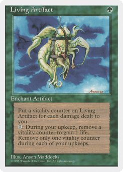 Enchant artifact Whenever you're dealt damage, put that many vitality counters on this Aura. At the beginning of your upkeep, you may remove a vitality counter from this Aura. If you do, you gain 1 life.