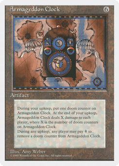 At the beginning of your upkeep, put a doom counter on this artifact. At the beginning of your draw step, this artifact deals damage equal to the number of doom counters on it to each player. {4}: Remove a doom counter from this artifact. Any player may activate this ability but only during any upkeep step.