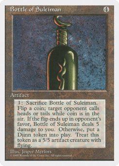 {1}, Sacrifice this artifact: Flip a coin. If you win the flip, create a 5/5 colorless Djinn artifact creature token with flying. If you lose the flip, this artifact deals 5 damage to you.