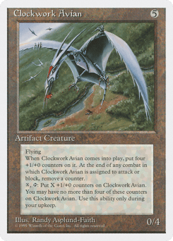 Flying This creature enters with four +1/+0 counters on it. At end of combat, if this creature attacked or blocked this combat, remove a +1/+0 counter from it. {X}, {T}: Put up to X +1/+0 counters on this creature. This ability can't cause the total number of +1/+0 counters on this creature to be greater than four. Activate only during your upkeep.