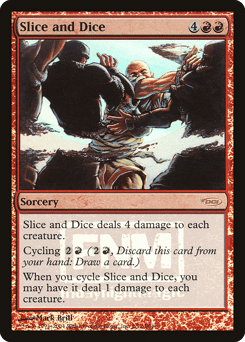 Slice and Dice deals 4 damage to each creature. Cycling {2}{R} ({2}{R}, Discard this card: Draw a card.) When you cycle this card, you may have it deal 1 damage to each creature.