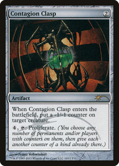 When Contagion Clasp enters, put a -1/-1 counter on target creature. {4}, {T}: Proliferate. (Choose any number of permanents and/or players, then give each another counter of each kind already there.)