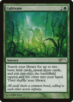Search your library for up to two basic land cards, reveal those cards, put one onto the battlefield tapped and the other into your hand, then shuffle.