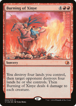 You destroy four lands you control, then target opponent destroys four lands they control. Then Burning of Xinye deals 4 damage to each creature.