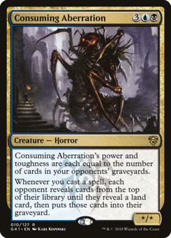 Consuming Aberration's power and toughness are each equal to the number of cards in your opponents' graveyards. Whenever you cast a spell, each opponent reveals cards from the top of their library until they reveal a land card, then puts those cards into their graveyard.
