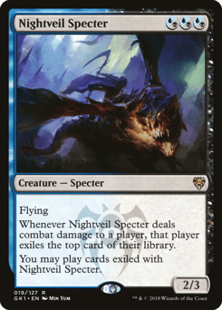 Flying Whenever this creature deals combat damage to a player, that player exiles the top card of their library. You may play lands and cast spells from among cards exiled with this creature.