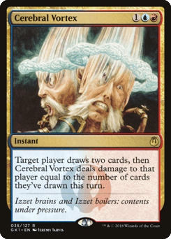 Target player draws two cards, then Cerebral Vortex deals damage to that player equal to the number of cards they've drawn this turn.
