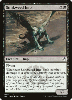 Flying Whenever this creature deals combat damage to a creature, destroy that creature. Dredge 5 (If you would draw a card, you may mill five cards instead. If you do, return this card from your graveyard to your hand.)