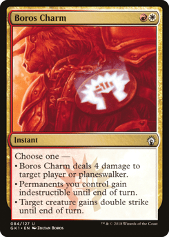 Choose one — • Boros Charm deals 4 damage to target player or planeswalker. • Permanents you control gain indestructible until end of turn. • Target creature gains double strike until end of turn.