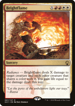 Radiance — Brightflame deals X damage to target creature and each other creature that shares a color with it. You gain life equal to the damage dealt this way.