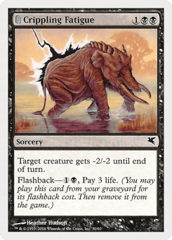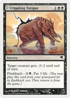 Target creature gets -2/-2 until end of turn. Flashback—{1}{B}, Pay 3 life. (You may cast this card from your graveyard for its flashback cost. Then exile it.)
