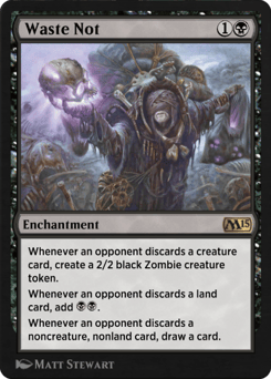 Whenever an opponent discards a creature card, create a 2/2 black Zombie creature token. Whenever an opponent discards a land card, add {B}{B}. Whenever an opponent discards a noncreature, nonland card, draw a card.