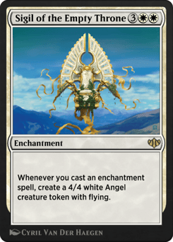 Whenever you cast an enchantment spell, create a 4/4 white Angel creature token with flying.