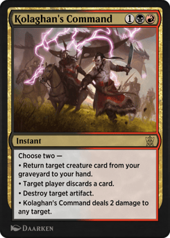 Choose two — • Return target creature card from your graveyard to your hand. • Target player discards a card. • Destroy target artifact. • Kolaghan's Command deals 2 damage to any target.