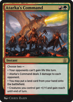 Choose two — • Your opponents can't gain life this turn. • Atarka's Command deals 3 damage to each opponent. • You may put a land card from your hand onto the battlefield. • Creatures you control get +1/+1 and gain reach until end of turn.