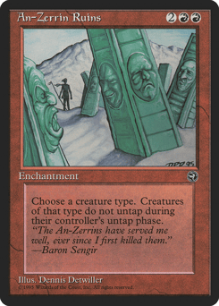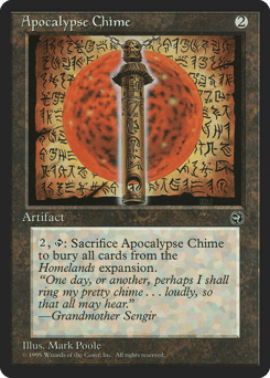{2}, {T}, Sacrifice this artifact: Destroy all nontoken permanents with a name originally printed in the Homelands expansion. They can't be regenerated.