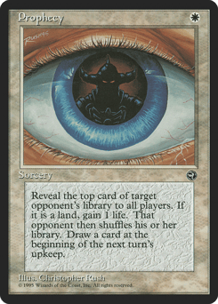 Reveal the top card of target opponent's library. If it's a land, you gain 1 life. Then that player shuffles. Draw a card at the beginning of the next turn's upkeep.
