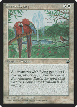 Bird creatures get +1/+1. {1}{W}: Target Bird creature gains banding until end of turn. (Any creatures with banding, and up to one without, can attack in a band. Bands are blocked as a group. If any creatures with banding a player controls are blocking or being blocked by a creature, that player divides that creature's combat damage, not its controller, among any of the creatures it's being blocked by or is blocking.)