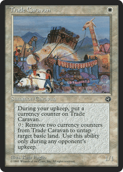 At the beginning of your upkeep, put a currency counter on this creature. Remove two currency counters from this creature: Untap target basic land. Activate only during an opponent's upkeep.