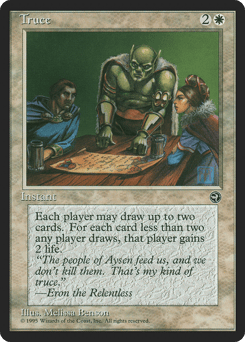 Each player may draw up to two cards. For each card less than two a player draws this way, that player gains 2 life.