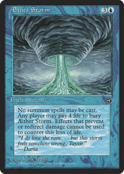 Creature spells can't be cast. Pay 4 life: Destroy Aether Storm. It can't be regenerated. Any player may activate this ability.