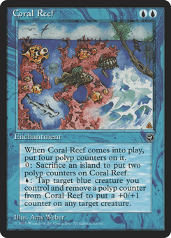 This enchantment enters with four polyp counters on it. Sacrifice an Island: Put two polyp counters on this enchantment. {U}, Tap an untapped blue creature you control, Remove a polyp counter from this enchantment: Put a +0/+1 counter on target creature.